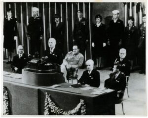 His first act as President was to approve going forward with the San Francisco conference as scheduled. He addressed the delegation by radio hookup not in person on April 25, 1945, thirteen days after assuming the presidency. His radio-delivered remarks were critiqued as a poor speech with “windy, mostly meaningless pronouncements,” not the direct talk that became his later style.
