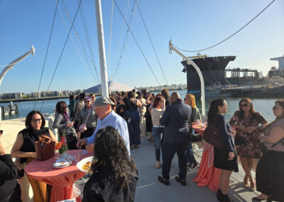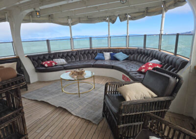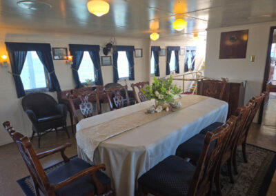 Maximum passenger capacity is 120 for a standing, cocktail-style buffet event. This includes your catering servers and any other onboard event participants and assistants. Sit down table seating will be more limited with a smaller number of guests.